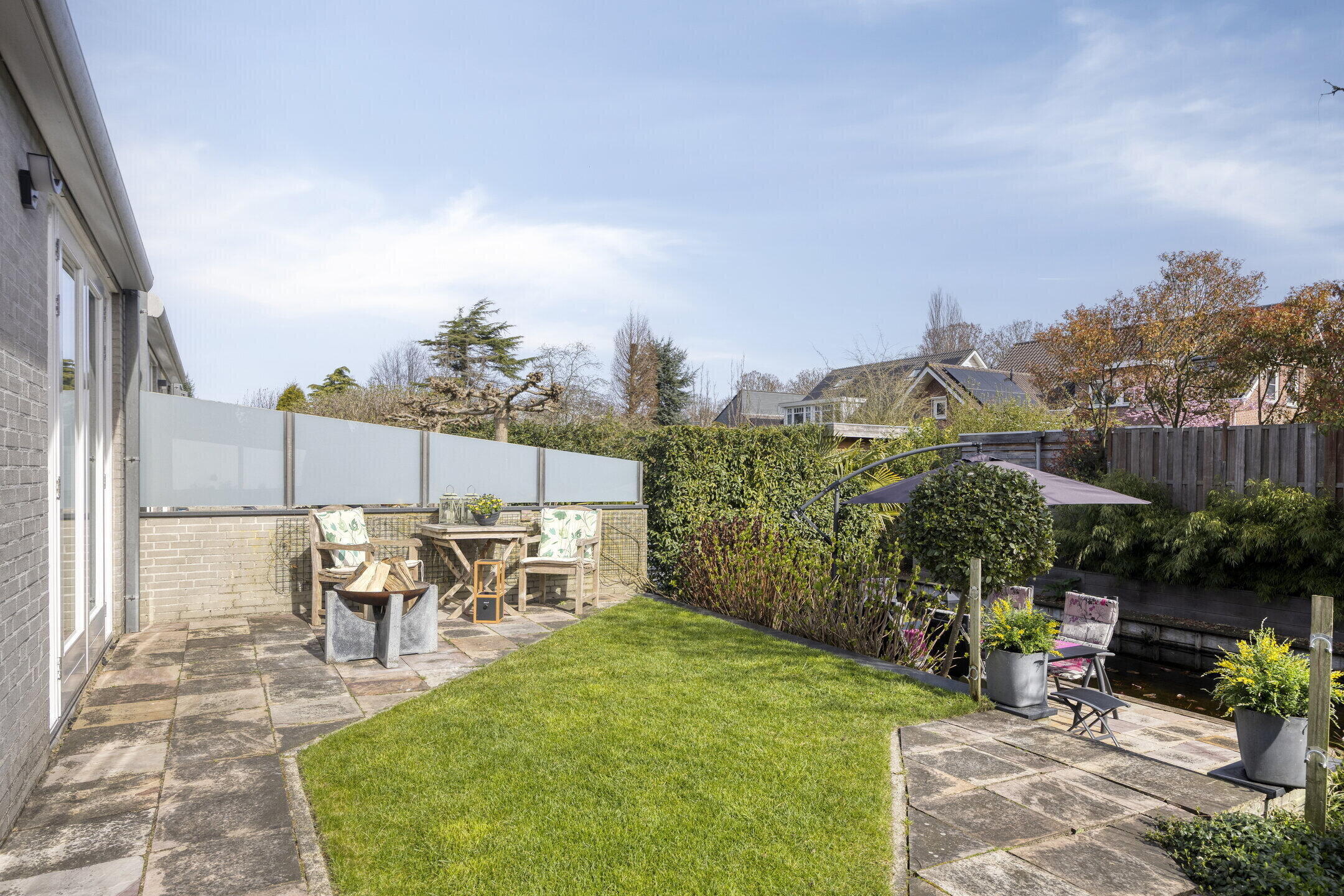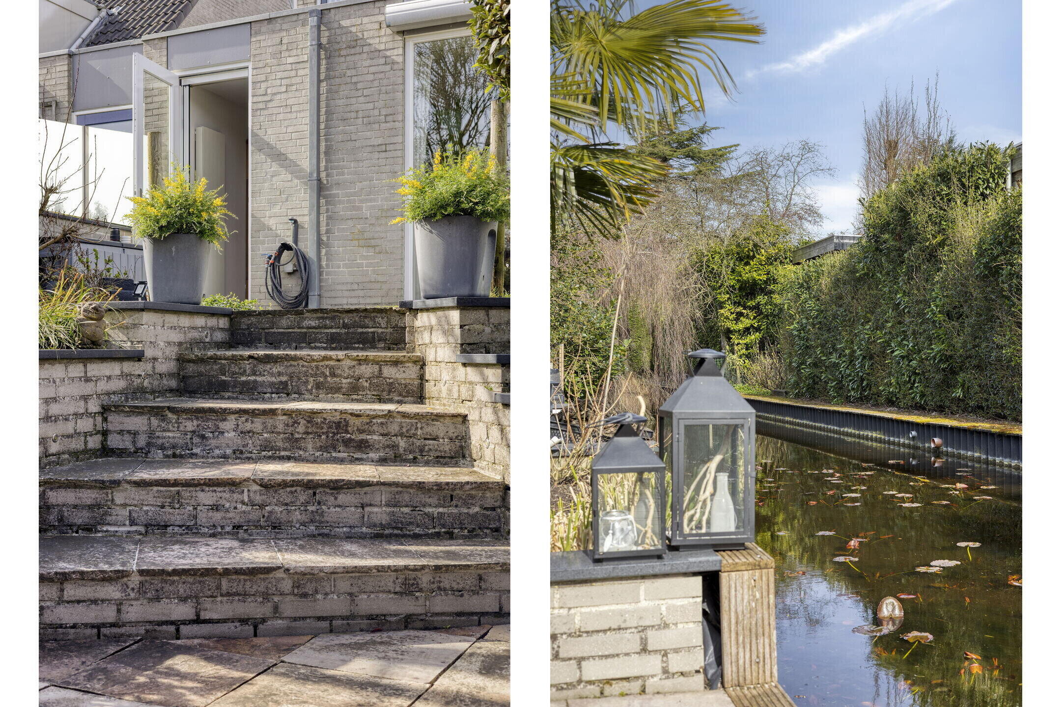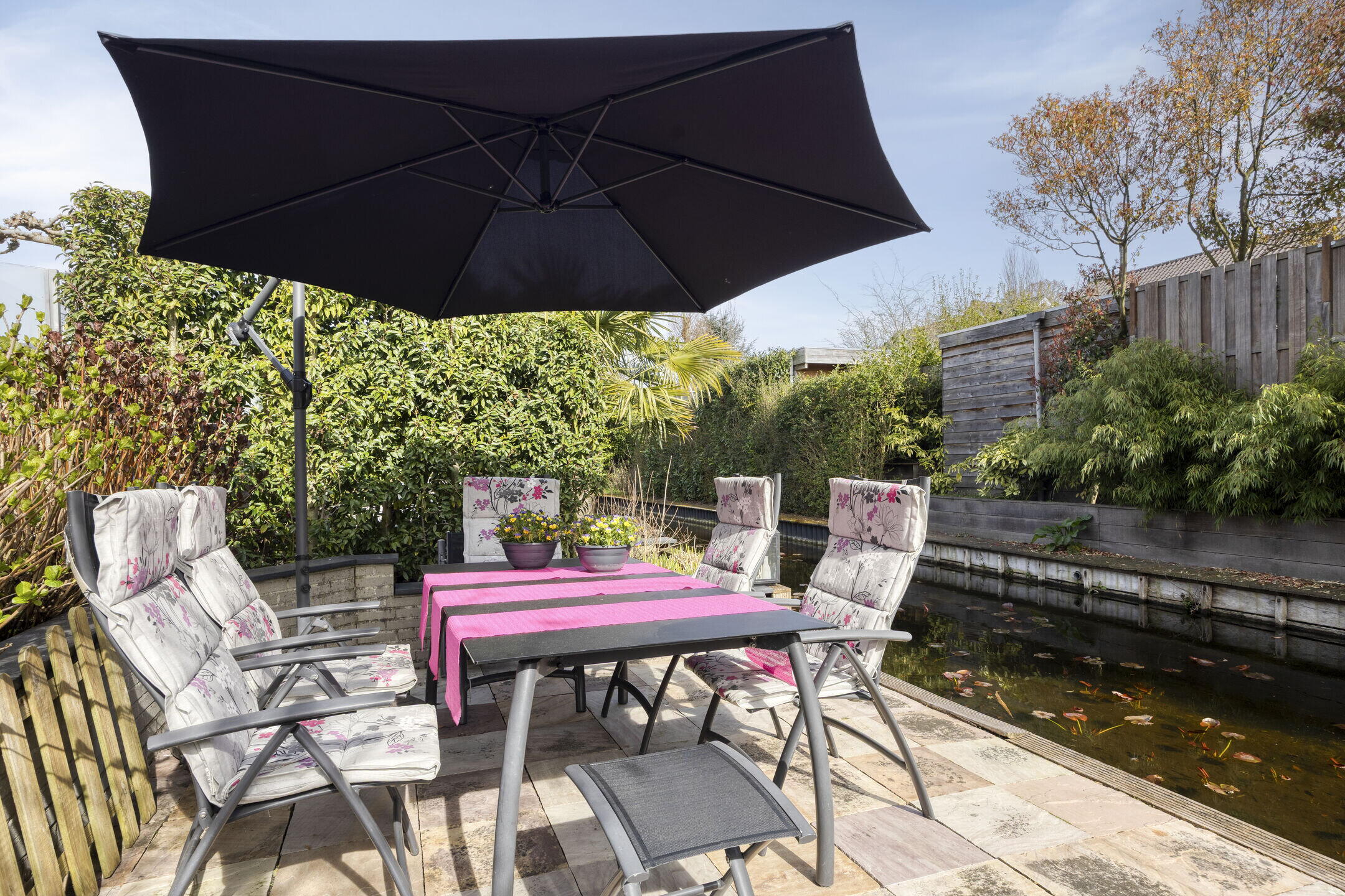 De zonnige achtertuin ligt direct aan het water en biedt een heerlijke plek om te ontspannen. Het terras bij de woning is voorzien van zonwering en via een trap bereikt u een lager gelegen terras aan het water – een unieke en sfeervolle toevoeging.