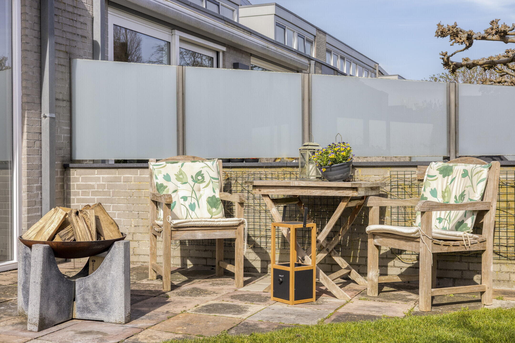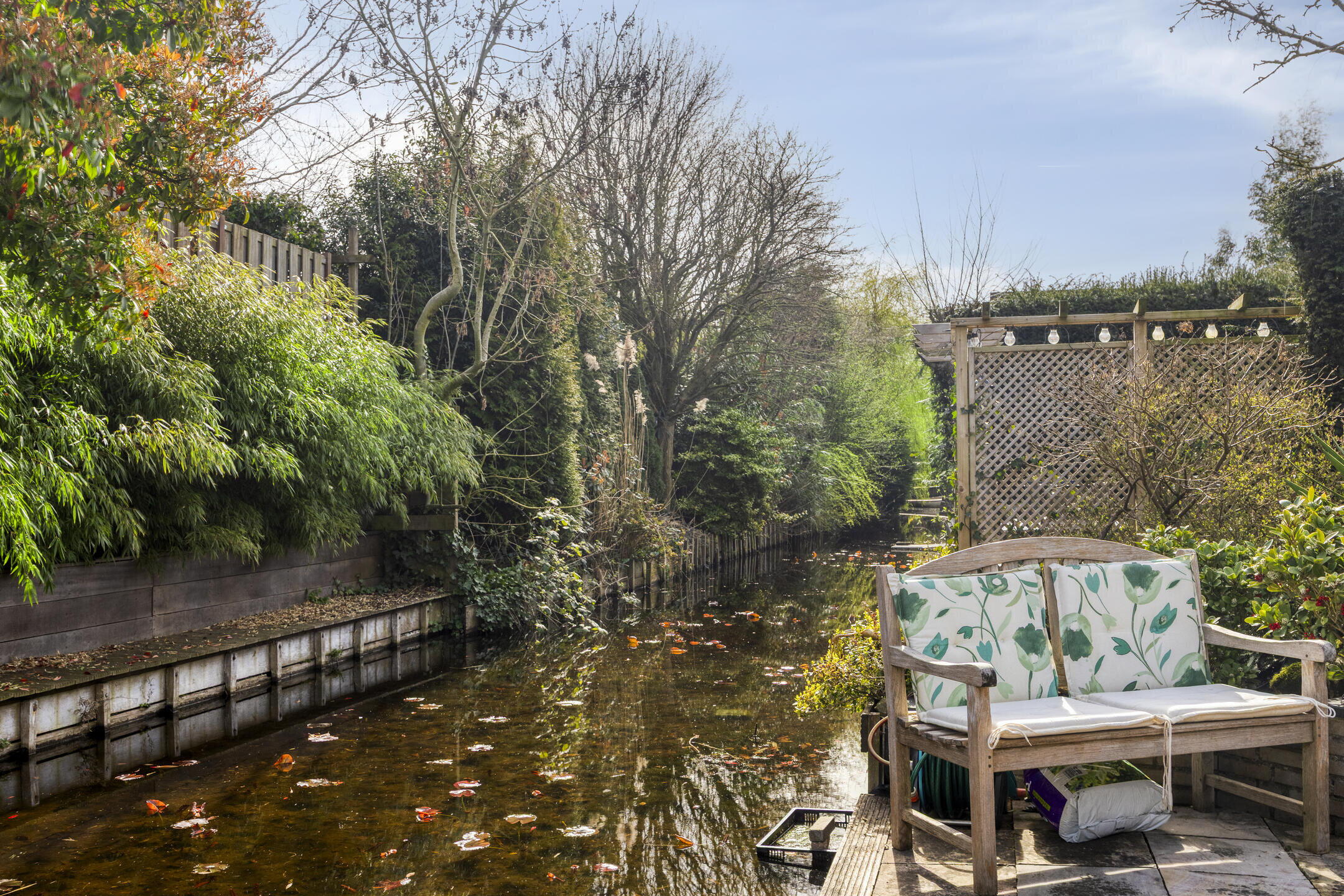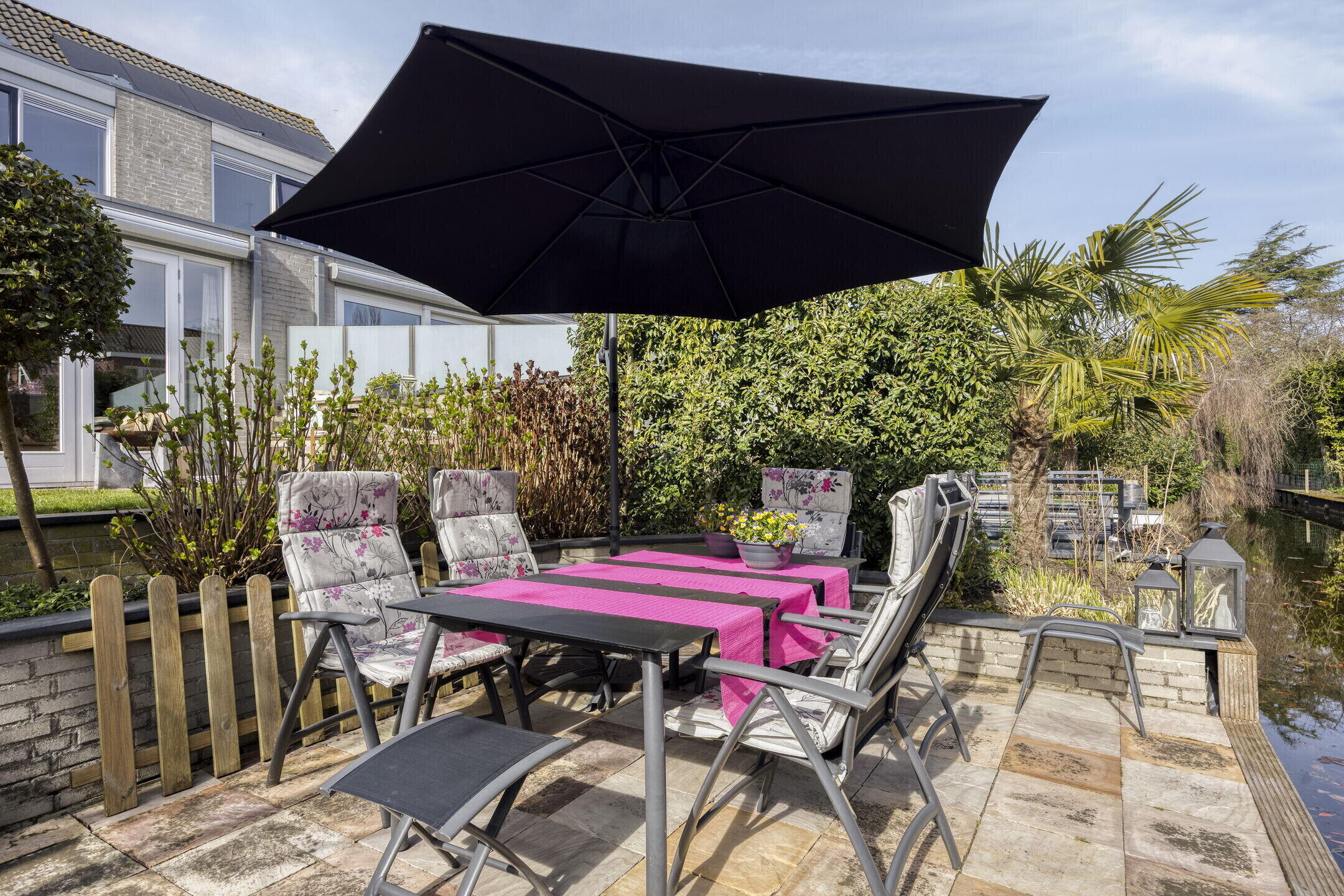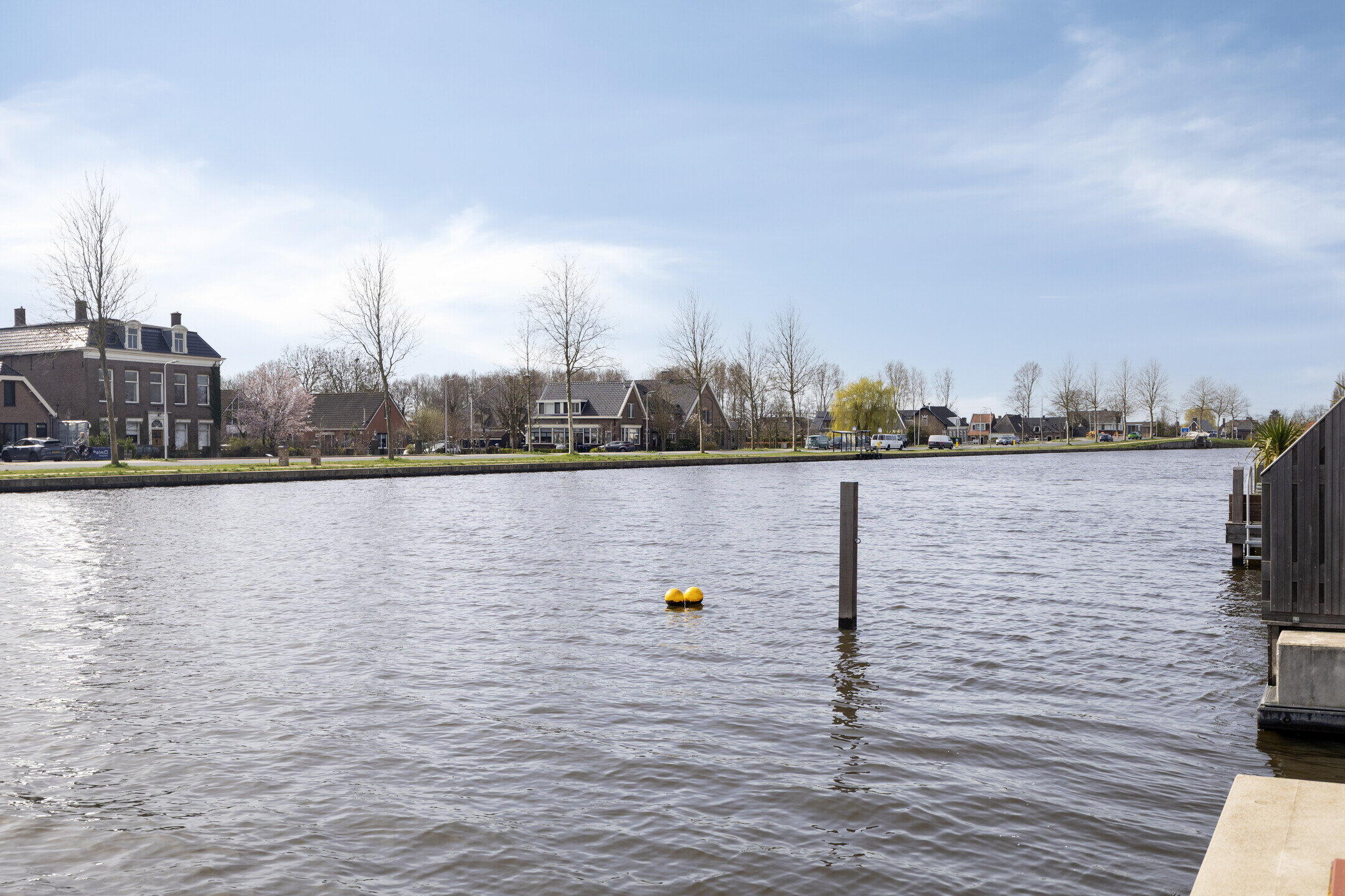 De zonnige achtertuin ligt direct aan het water en biedt een heerlijke plek om te ontspannen. Het terras bij de woning is voorzien van zonwering en via een trap bereikt u een lager gelegen terras aan het water – een unieke en sfeervolle toevoeging.
