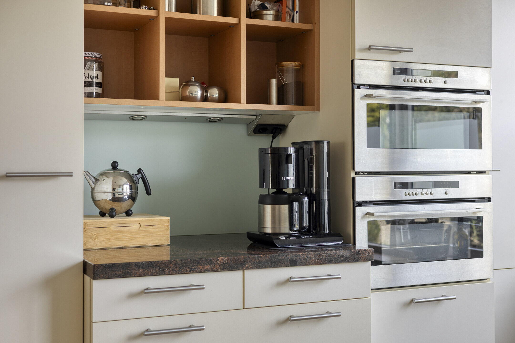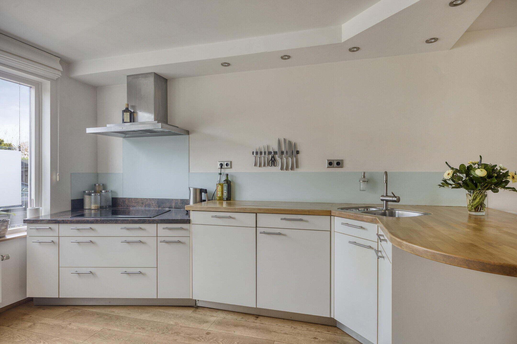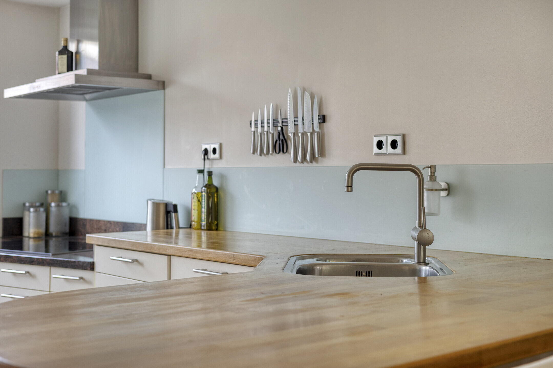 De open keuken is ruim opgezet en van alle gemakken voorzien, met onder andere een kookplaat, afzuigkap, vaatwasser, koelkast en combi-oven/magnetron. Een heerlijke plek voor zowel dagelijks gebruik als uitgebreid koken en tafelen.